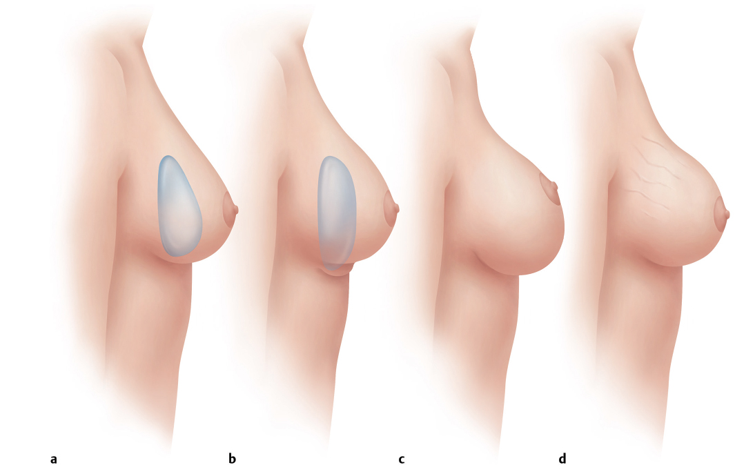 Surgical techniques for correction of all three of these complications—bottoming out/stretch, wrinkling/rippling, and capsular contracture—contain many of the same surgical techniques. When approaching patients with these complications, it is important to do as much as we can surgically to improve the result so as to decrease the chance of further recurrence or incomplete correction. Therefore, changing planes to add more coverage over the device, exchanging saline for silicone devices, and using standard techniques are all important. New surgical scaffolds or acellular dermis are often helpful in further supporting the breast soft tissues as an internal bra, hammock, or sling as well as providing a tenting effect over the device to decrease visibility.
