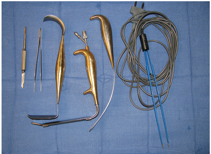 Five specialized instruments are recommended for this procedure. These include a double-ended breast retractor, an implant spatula, a fiberoptic nonserrated lighted retractor with smoke evacuation capability, a monopolar hand-switching electrocautery, and a good overhead lighting and preferably a fiberoptic headlight (Fig. 13‑3).