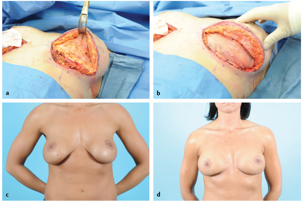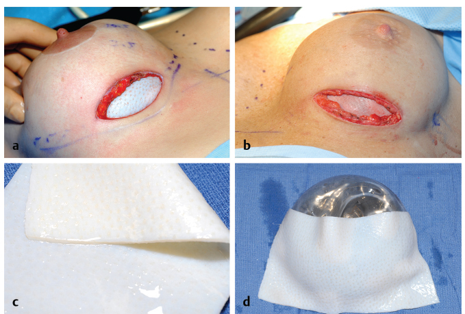 Secure the acellular dermis to the chest wall to provide a tenting effect. Drains and adequate filling of the space on some tension are important to increase adherence and integration and revascularization of the matrix material.