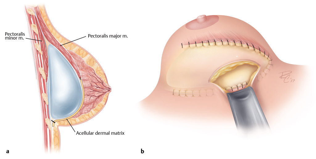 In cases where a patient will not accept a submuscular implant or where there is no muscle from prior surgery or congenital absence, there are some alternatives. This technique may not produce as significant an improvement as the pectoral extension, reconstructive technique but still may provide improvement. Again minimizing the inherent device wrinkling using an implant with a higher fill volume will provide an advantage. In addition, a surgical scaffold or acellular dermis may be inset either prepectoral or intracapsular, but sutured to the chest wall and placed on some tension to provide for less visible wrinkling through the material versus what the onlay may provide on its own just from the thickness and barrier of the material itself. In these instances, an 8 × 16 cm piece or larger may be oriented vertically and positioned over the device. The medial aspect of the breast typically is the thinnest and thus the material may be placed more medial to maximize coverage, although this may vary patient to patient.