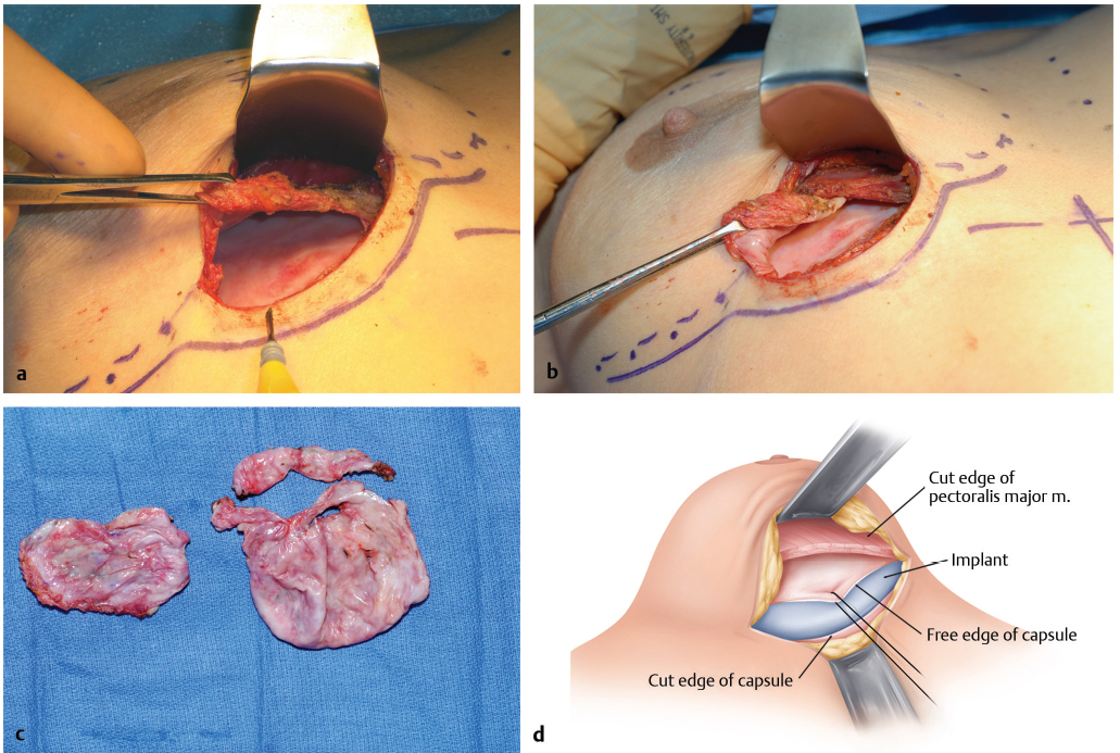 This is a very powerful procedure to learn and use. More advanced techniques include rotating the flaps for coverage and using the posterior capsule or only partial portions of the capsule to define the medial or lateral borders versus elevating the entire capsular surface. If an implant is in the subglandular space, a portion of the capsule may be retained for coverage, but a completely new submuscular pocket is made using a capsular flap or neo-subpectoral pocket technique.