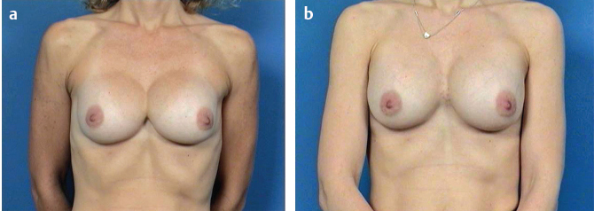 In the case of a prior subglandular implant, total capsulectomy with implant removal is recommended and a site change typically performed with or without addition of an acellular dermis as a pectoral extension. Shown in Fig. 13‑10 is a patient on 1-year follow-up with three times recurrent capsular contracture treated with capsulectomy and an acellular dermal matrix as a pectoral extension with completely soft breasts.