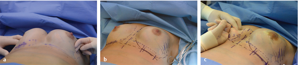 The standard inframammary closure may then be performed in three layers closing the superficial fascia with a running or interrupted absorbable suture such as 2–0 Vicryl followed by a subdermal 3–0 Monocryl suture and a running 4–0 Monocryl subcuticular suture as previously described. Barbed 3–0 Monoderm quill suture may also be used subcutaneously in a running two-layer fashion, which expedites the closure which we have used in more than 1,200 patients without wound healing issues of this transverse scar. In the bottoming out deformity, the de-epithelialized dermis may also be used to support the closure.