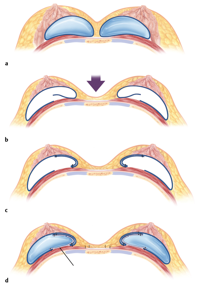 Most frequently, tissue coverage is such a priority that submuscular symmastia is retained as submuscular, either by leaving the implant in the existing pocket and closing off its medial extent with a capsulorrhaphy or by creating an entirely new pocket between the anterior capsule wall and the overlying breast/muscle tissue, known as a neo-subpectoral pocket.