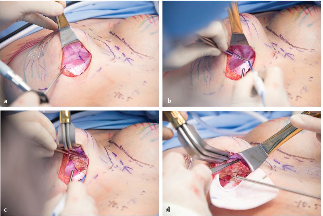 If the patient has a concurrent capsular contracture or calcification, or at the surgeon’s discretion, the anterior capsule is resected to the inferior border of the pectoralis major muscle, or capsule removed completely. If this is undertaken, strong consideration for acellular dermal support should be made, which will further define and support the fold, support the weight of the device, help mitigate future stretch deformity, provide additional coverage in the often thinned lower breast pole, and decrease circumferential capsule formation.