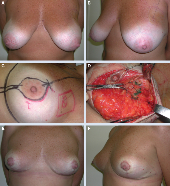 This 61-year-old patient was diagnosed with a 3.5 cm invasive ductal carcinoma of the left breast (A and B). The patient underwent a left central-inferior quadrantectomy and total axillary dissection, immediately followed by a bilateral reduction mammaplasty reconstruction. A total of 225 g was removed from the left breast and 235 g from the right breast (C and D). She is shown 1 year postoperatively with a good outcome after radiotherapy (E and F).