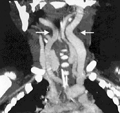 Although routine blood work is not indicated in otherwise healthy children, if there is concern for bleeding disorders or platelet dysfunction, appropriate laboratory work and correction of bleeding abnormalities should be completed prior to undergoing VPI surgery. Several studies cite younger age as a possible risk factor for perioperative complications. Fraulin et al. found that patients who developed airway obstruction after PF were younger than patients who did not develop this complication (7.8 years versus 9.3 years).4 In a retrospective review of SP, all cases of prolonged airway compromise occurred in patients 5 years old or younger.5 However, it is has been shown that SP can be performed safely in children as young as 3 years of age.11 Consideration should be given to assessing the position of the internal carotid arteries in patients with DiGeorge or velocardiofacial syndromes ( Fig. 14.1 ).