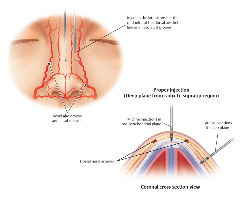 Fig. 14.1 Vasculature of the nasal aesthetic unit. The facial artery travels upward to become the angular artery. Important branches of the facial artery include the lateral nasal artery and inferior alar artery. The paired dorsal nasal arteries are located lateral to the midline along the dorsum of the nose.Fig. 14.2 Vasculature of the nose shown from a basal view. The inferior alar artery is a branch of the facial artery, which courses along the base of the nose. The columellar artery arises as a branch from the inferior alar artery and is divided during an open rhinoplasty. The marginal artery runs superficial along the alar rim.Fig. 14.3 Schematic of proper injection technique. Injections can be performed deep in the midline from the radix to the supratip break to avoid intra-vascular injection. If injections are performed laterally, they are performed deeply at the midpoint of the dorsal aesthetic line and the nasofacial groove to prevent inadvertent injury to the dorsal nasal artery and angular artery.Fig. 14.4 Schematic of improper injection technique. Injections in a superficial plane lateral to the midline place the dorsal nasal artery at risk. Injections in a superficial plane along the nasal sidewall place the angular artery at risk. Injections in a superficial plane along the alar groove can compromise the lateral nasal artery. Lastly, superficial injections in the midline of the tip can injure the columellar artery.