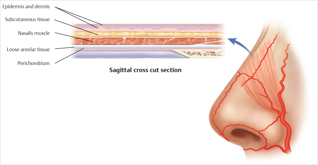 The layers of the nose are as follows: epidermis, dermis, subcutaneous fat, muscle, fascia, areolar tissue, perichondrium/periosteum, and cartilage/bone1(▶Fig. 14.5and ▶Fig. 14.6)