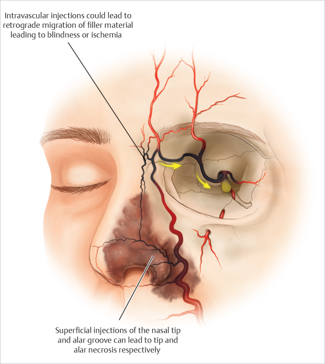 Vasculature in the nose is superficially located beneath the dermis. Injections should be carried out deep to the musculoaponeurotic layers (Video 14.2).