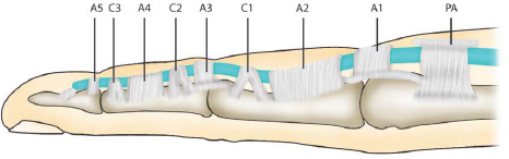 Pulley system (► Fig. 14.2): Five annular (A) and three cruciate (C) pulleys: