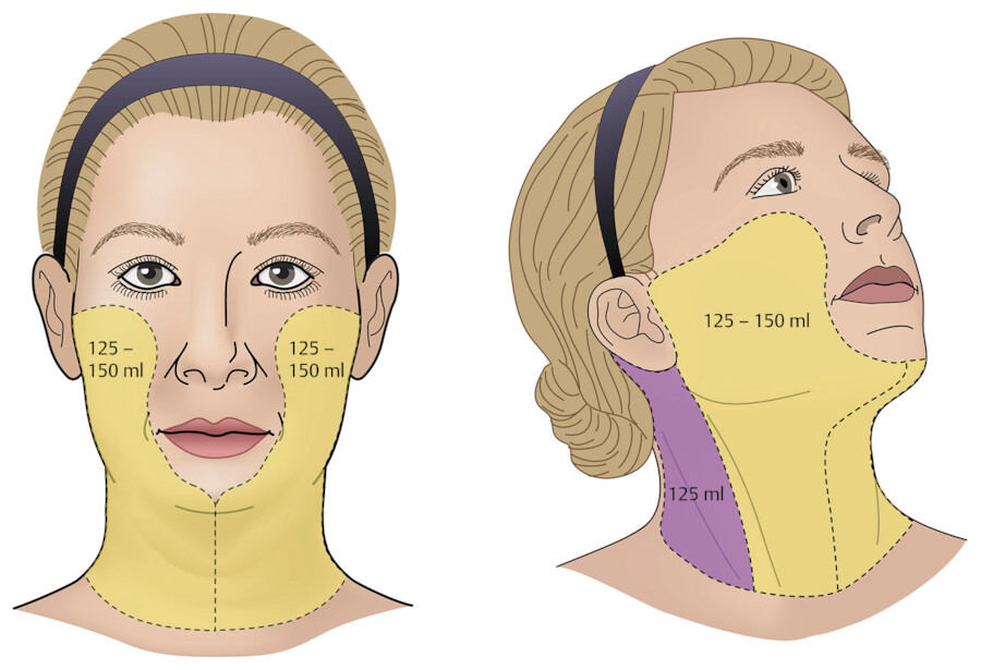 Though volumes may vary, the cheek and neck often require 125 to 150 mL of tumescent fluid for each side. The postauricular areas and posterior neck may take 125 mL per side. Therefore, for a typical bilateral facial procedure approximately 600 mL of tumescent lidocaine may be appropriate (Fig. 14.2). Smaller volumes infused with a syringe may be best for the pretragal area and nasolabial folds if one of these is the only area of concern.