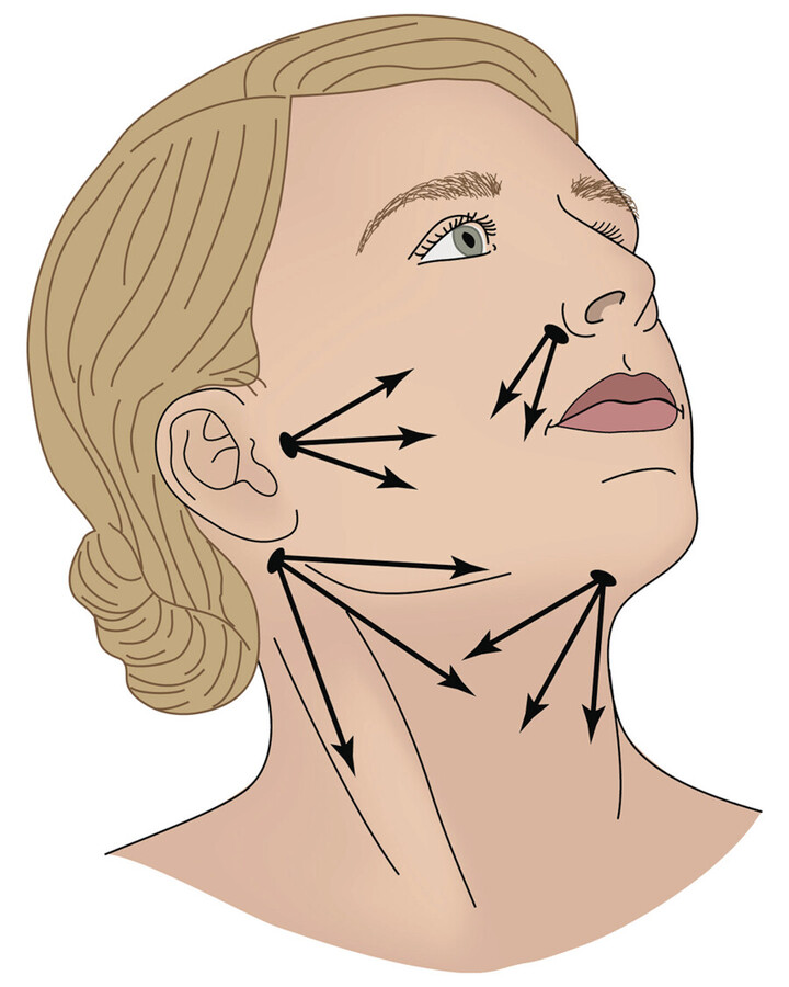 Fig. 14.4 Entry ports for access and treatment of the face and neck. Radial, spoke-wheel treatment patterns are preferred in their ability to prevent contour deformities. The use of multiple ports for one treatment area helps to further blend the overall result.