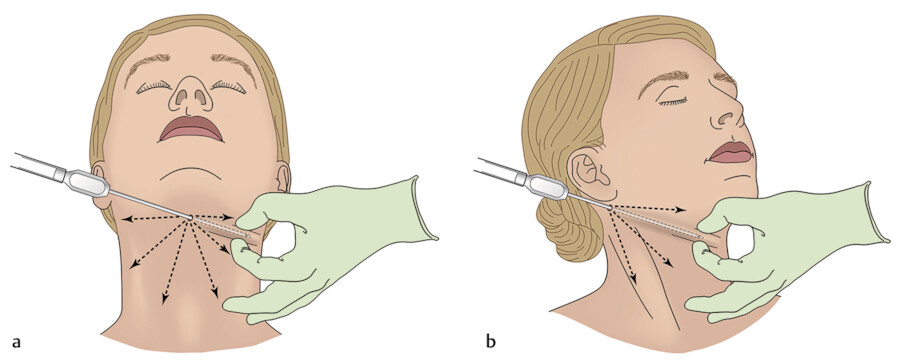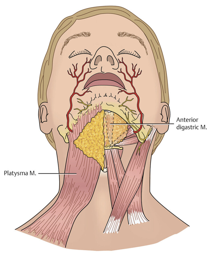 Submental liposuction begins with the creation of an entry point by punch biopsy tool or scalpel incision 1 mm posterior to the submental crease. The anatomic location of incision placement in this area is critical to prevent exaggeration of the submental crease after scar contracture during the healing process. Some surgeons support using a larger 2- to 3-mm cannula while others use a 1- to 2-mm cannula due to the benefit of the smaller entry site in the contest of the limited fat to be removed. The advantage of an incision is that a platysmaplasty or, in rare cases, the removal of the postplatysmal fat pads can be achieved if the incision is extended. Notably, platysmaplasty may cause elevation of the deep fat pad and make its removal unnecessary. Regardless of the method used to make it, the entry site should be slightly larger than the size of the cannula to reduce trauma to the skin edges.
