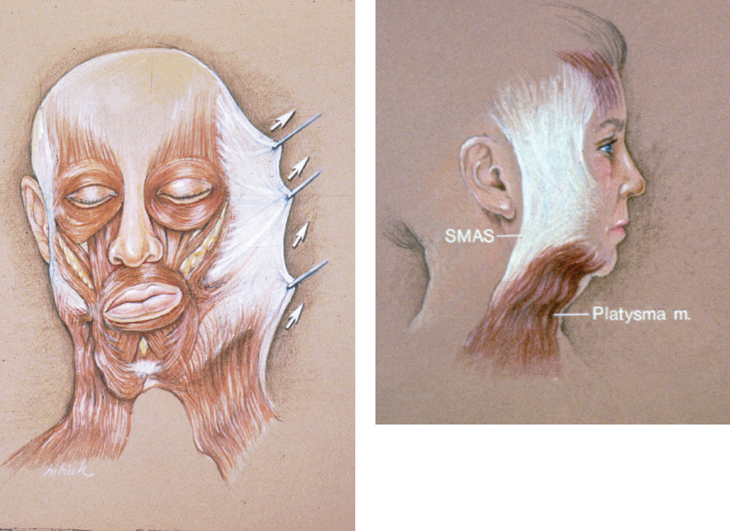 The fundamental concept of rhytidectomy is based on certain anatomical relationships of the tissues. The elasticity and condition of the overlying skin, including its degree of photodamage and rhytid formation, is important. The relationship with the underlying subcutaneous tissue, including the vector of descent as a result of gravity, true ptosis, or abnormal accumulation and distribution of fat, must be noted. Facial musculature is enveloped by continuous fascia that extends to the preparotid region. This fascia, which is contiguous with the platysma muscle of the neck, is the SMAS, first described as a dynamic contractile and fibromuscular web by Mitz and Peyronnie. 3 The fascia deep to this is the superficial layer of the deep cervical fascia that envelopes and covers the sternocleidomastoid muscle, as well as the parotid tissues and parotidomassoteric fascia. SMAS is also superficial to the superficial layer of the deep temporal fascia as well as to the periosteum of the forehead. The SMAS is contiguous with the galea of the scalp. In the neck anteriorly, the platysma muscle may or may not interdigitate to form a connected sling depending on age. Often, there is a laxity and dehiscence of the anterior borders of the platysma muscle, creating banding in the neck.