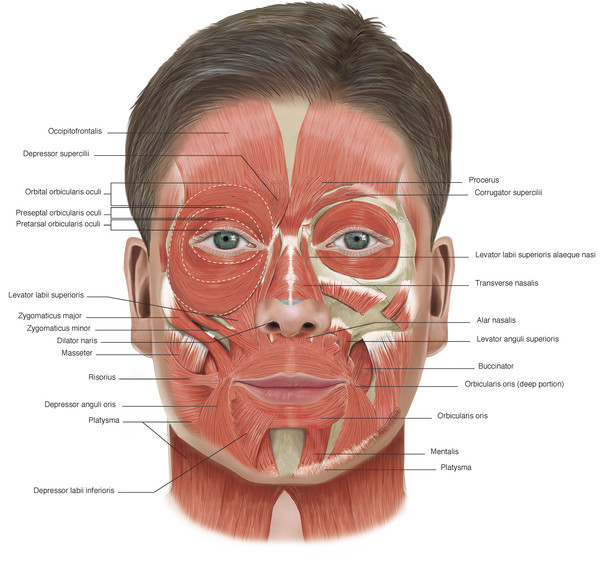 Botulinum toxin injections for periocular and facial rejuvenation can be used alone or in combination with other nonsurgical treatment modalities (e.g., dermal fillers) and can be used to improve the outcome of some surgical procedures. The injections have an excellent safety record, having long been used in ophthalmic practice for the treatment of essential blepharospasm and strabismus. Their safe and successful use in aesthetic treatments requires an understanding of the anatomy of the muscles of facial expression (Fig. 14‑1) and a meticulous injection technique, particularly in the periocular area. The major advantage of the use of botulinum toxin injections is the fact that any unwanted effects eventually wear off spontaneously, usually with no long-term sequelae.