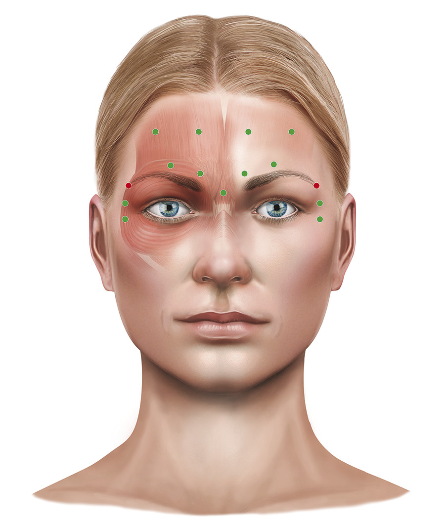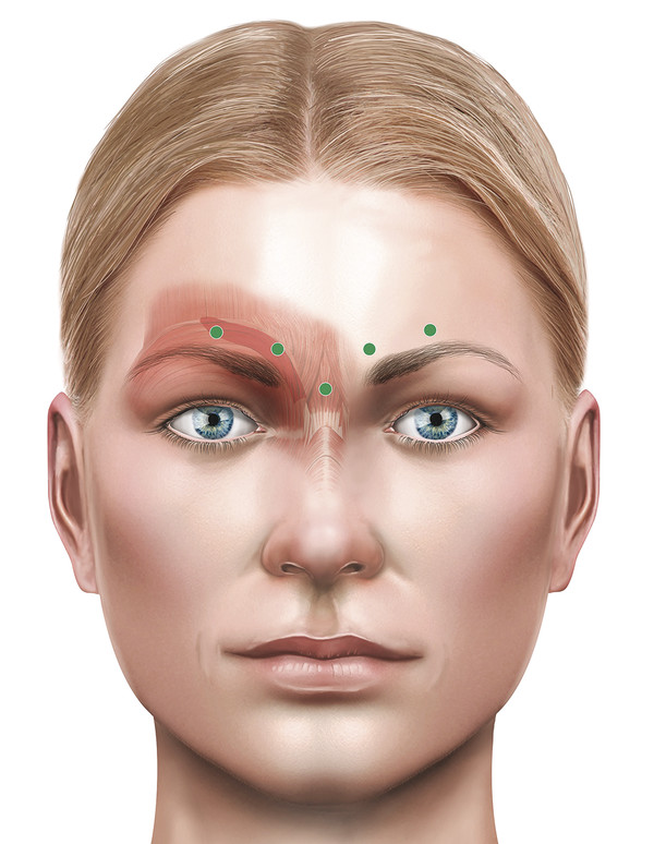 Fig. 14.7 The typical sites of injection for the balanced treatment of horizontal forehead lines while trying to maintain a good height and contour to the brows.