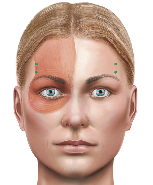 Fig. 14.3 Injections given to treat temporal peaking of the brows.