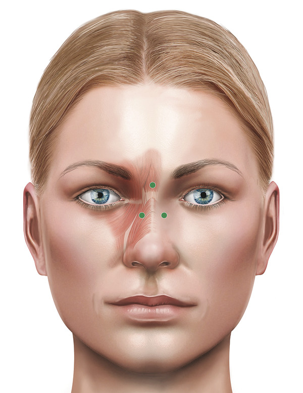 Fig. 14.2 The typical sites of injection in the glabella.