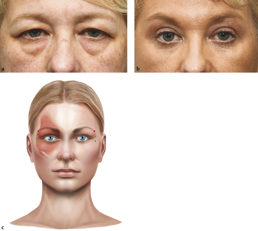 Fig. 14.5 (a) A pretreatment photograph of a middle-aged female patient with a bilateral temporal brow ptosis. She also has dermatochalasis and a prolapse of her medial and central lower lid fat pads. (b) A posttreatment photograph of the same patient with her brows at rest. A temporal brow lift has been achieved after the injection of Azzalure, five injections of 15 units each to the glabella, two injections of 15 units each to the lateral canthus, and a single 10-unit injection just above and lateral to the tail of the brow. She has also undergone a bilateral upper lid blepharoplasty and a bilateral lower lid transconjunctival blepharoplasty with fat repositioning. She did not require a surgical brow lift. (c) The typical sites of injection for the treatment of lateral canthal rhytids (black dots). The red dots depict the additional injections that are used to achieve a greater degree of temporal brow lift.