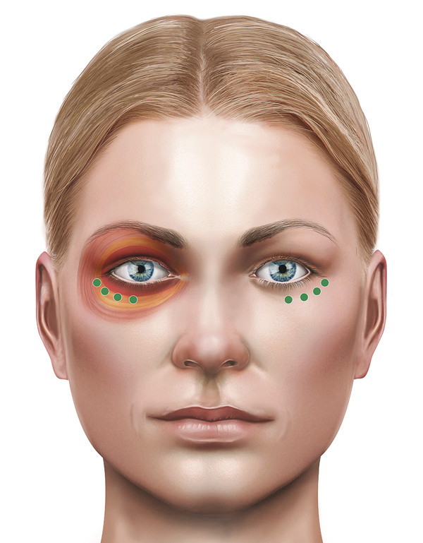 Injections in the lower eyelid should be confined to the lateral half to lateral third of the eyelid and should be very conservative. The muscle that is targeted in the lower eyelid is the preseptal orbicularis oculi muscle. The medial aspect of the lower eyelid is avoided to prevent any risk of spread of the toxin to the inferior oblique muscle, which could result in diplopia. Typically two to three injections are given at a total dose of 3 to 6 units. Higher doses can result in a retraction of the lower eyelid or the appearance of a malar “bag” in a predisposed individual related to loss of support of the lateral cheek by the weakened orbicularis muscle.