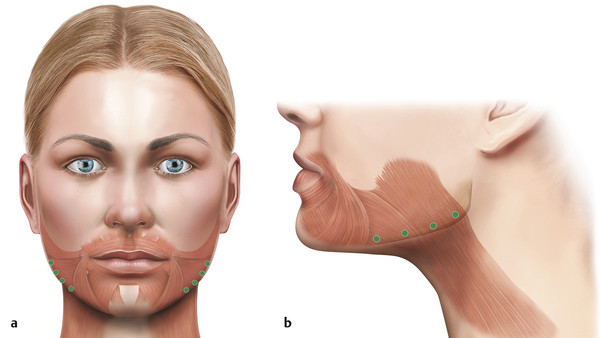 Injections into the chin can help to improve a horizontal line or dimpling of the skin in this area. The mentalis muscle is the target muscle. Typically, two separate injections are given at a total dose of 10 to 15 units. Injections given more laterally over the mandible target the depressor anguli oris, which can help to lift the outer aspect of the lips, raising the smile. Typically, a single injection is given into each muscle at a dose of 10 units. A conservative approach should be adopted to avoid any problems with speech, eating, or drinking because of the involvement of the depressor labii inferioris.