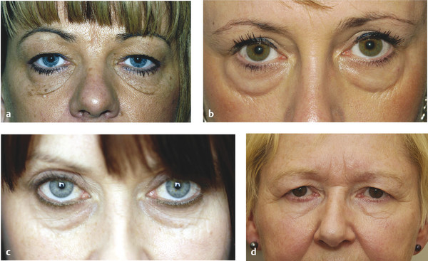 The cosmetic effects of upper eyelid dermatochalasis and brow ptosis can lead to complaints of a tired appearance. Lower eyelid fat herniation can also lead to similar complaints (Fig. 15‑1b).