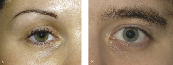 The amount of pretarsal skin “show” along with the amount of skin present from the lash line to the lowermost portion of the eyebrow, medially, centrally, and laterally. This can be difficult in patients who pluck or tattoo their eyebrows (Fig. 15‑24). Failure to recognize the true position of the eyebrow skin can lead to an over-resection of upper lid skin during the course of an upper lid blepharoplasty.