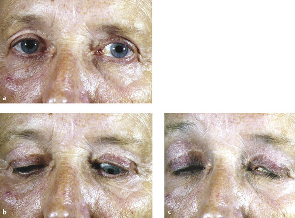 Isolated shortening of the anterior lamella of the lower eyelid results in ectropion, shortening of the middle lamella results in eyelid retraction with scleral show (Fig. 15‑13), and shortening of the posterior lamella results in entropion.