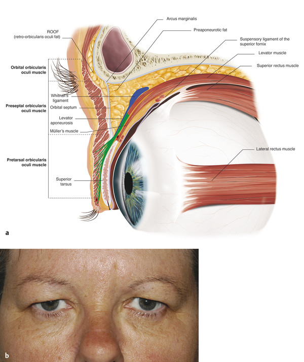 It is important to differentiate prolapsed preaponeurotic fat from retro-orbicularis oculi fat (ROOF) that has descended into the upper eyelid (Fig. 15‑4a). This may give rise to the appearance of upper eyelid “fullness” (Fig. 15‑4b). Although this descended fat can be gently debulked in some patients, it is preferable to reposition this as part of a browlift procedure if there is an associated brow ptosis.