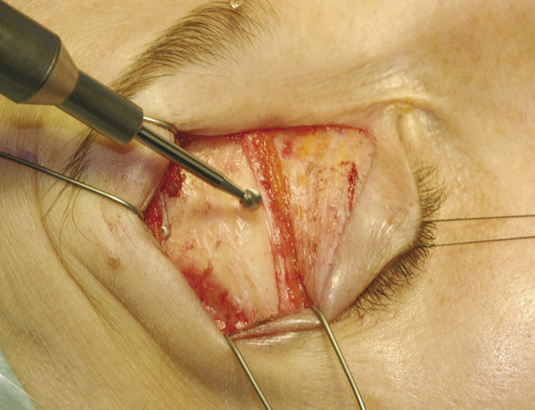 Some patients have very prominent superolateral bony margins that can also contribute to upper eyelid “fullness.” These can be exposed and reduced with the use of a diamond burr during the course of an upper eyelid blepharoplasty (Fig. 15‑5).