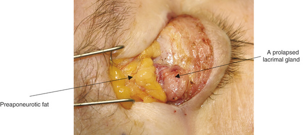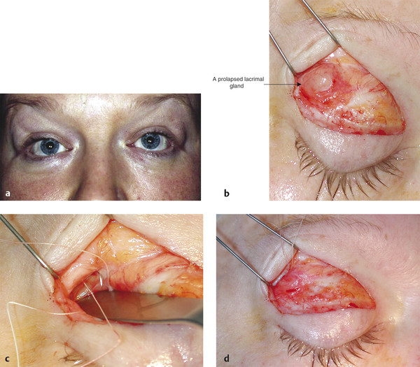 It is important to recognize a prolapsed lacrimal gland that may be responsible for lateral upper eyelid “fullness” or swelling, particularly as the central pre-aponeurotic fat pad can often extend more laterally than usual in some patients (Fig. 15‑6a). Prolapsed glands can be repositioned during the course of an upper eyelid blepharoplasty by suturing the gland to the periorbita of the lacrimal gland fossa (Fig. 15‑6b–d) (Video 15.1).