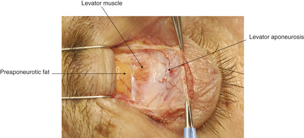 Posterior to the septum centrally lies the preaponeurotic orbital fat. Pressure applied to the lower eyelid can force the fat to prolapse, which helps to differentiate this from descended retro-orbicularis fat and from fatty degeneration of the levator muscle or Müller’s muscle. The preaponeurotic fat is a key landmark in upper eyelid surgery. The levator aponeurosis lies immediately beneath it (Fig. 15‑5; Fig. 15‑7).