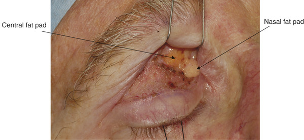 There are two main fat pads in the upper eyelid, a central fat pad and a medial or nasal fat pad. The medial fat pad is generally paler than the central fat pad (Fig. 15‑8).