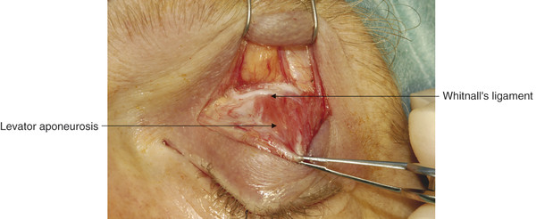Whitnall’s ligament supports the levator muscle complex, acting as a fulcrum for the action of the levator muscle, and should not be disturbed during surgery. It is a variably developed structure that runs from the lacrimal gland to the region of the trochlea (Fig. 15‑10).