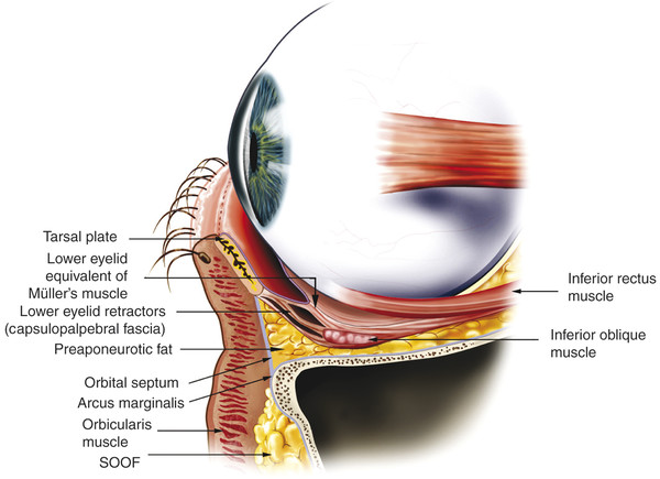 Deep to the orbicularis oculi muscle lies the orbital septum, which serves to retain orbital fat within the orbit. The septum is composed of inelastic fibrous tissue. Atrophy of the septum with age permits orbital fat to herniate anteriorly, creating typical lower lid “bags” (Fig. 15‑1b). The suborbicularis fascia, a plane of loose, fibrous connective tissue, lies between the orbicularis oculi muscle and orbital septum and provides a very good, relatively bloodless dissection plane. The orbital septum extends from the inferior border of the tarsus to fuse inferiorly with the periosteum of the infraorbital margin. This inferior attachment of the orbital septum to the periosteum, where there is a condensation of tissue, is referred to as the arcus marginalis (Fig. 15‑11).