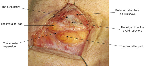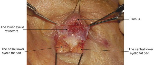 There are three fat compartments in the lower eyelid: medial, central, and lateral. Many delicate fibrous septa invest these compartments. The fat compartments lie between the capsulopalpebral fascia and the orbital septum. Because the capsulopalpebral fascia (the lower eyelid retractor) is analogous to the levator aponeurosis in the upper eyelid, the fat lying in front of the capsulopalpebral fascia can be considered to be analogous to the preaponeurotic fat in the upper eyelid. As in the upper eyelid, locating this fat is key to locating the eyelid retractor.
