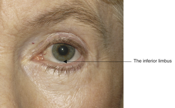 The lower eyelid skin crease is variable but is usually situated approximately 4 to 5 mm below the eyelid margin. The lateral canthal angle normally sits approximately 1 mm higher than the medial canthal angle.