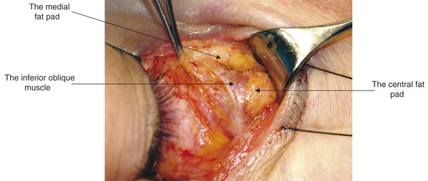 The inferior oblique muscle, originating from the anteromedial orbital wall, separates the medial and central fat compartments as it extends posterolaterally under the globe (Fig. 15‑14). In this position it is vulnerable to injury during the course of a lower eyelid blepharoplasty.