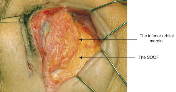 Fat that lies below the inferior orbital margin posterior to the orbicularis oculi muscle and just anterior to the periosteum is the SOOF (Fig. 15‑16).
