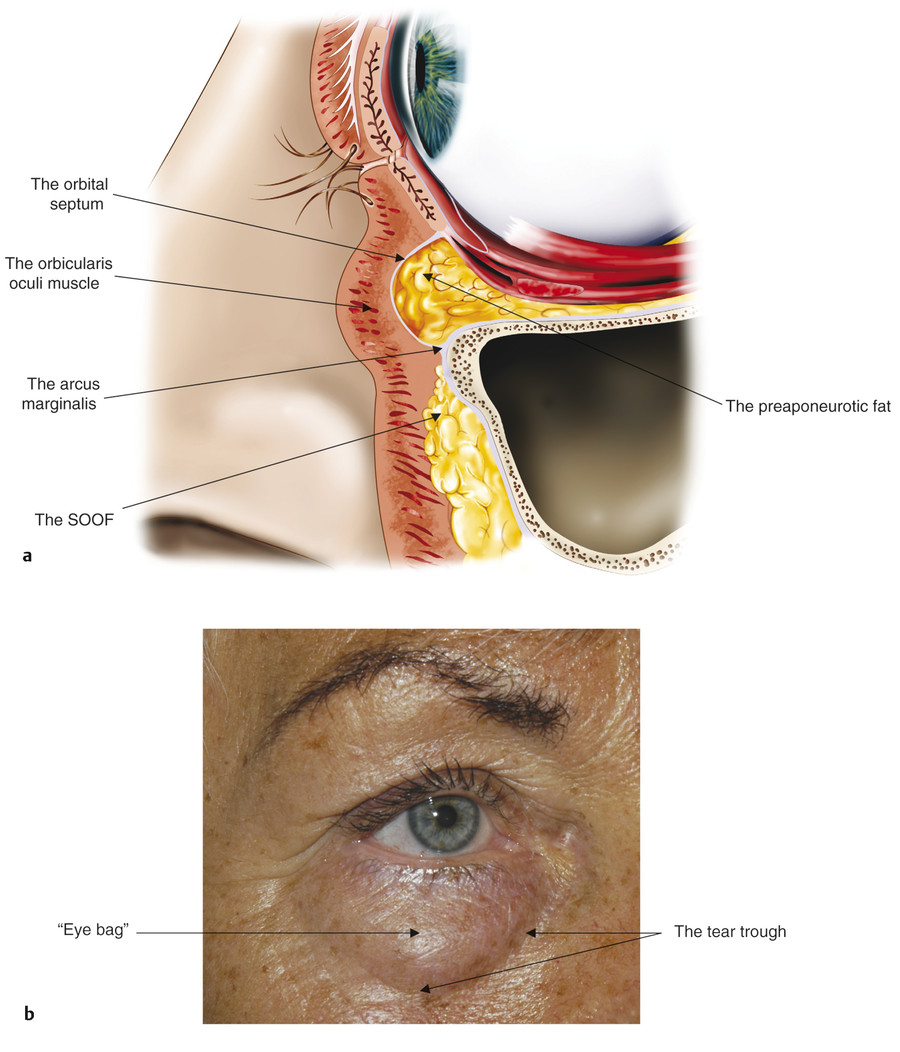 With increasing age, the orbicularis oculi muscle and the SOOF move inferiorly, leading to a double convexity of the lower eyelid. The superior convexity is caused by a herniation of orbital fat through a weakened orbital septum above the inferior orbital margin (Fig. 15‑17). The orbital margin itself is responsible for the horizontal concavity, and the SOOF, which has moved inferiorly, is responsible for the second convexity.