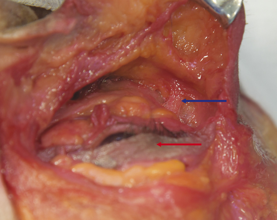 The orbicularis oculi muscle is immediately deep to the skin of the lower lid. This muscle extends from just below the ciliary margin, past the inferior orbital rim, and onto the cheek.
