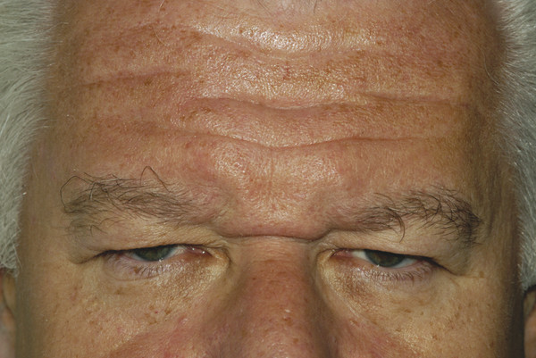 Patients who have a moderate to severe brow ptosis and dermatochalasis are obliged to use their frontalis muscle to overcome the superior visual field defect. Such patients commonly develop deep forehead furrows (Fig. 15‑23). This leads to fatigue of the frontalis muscle, which in turn can cause a headache.