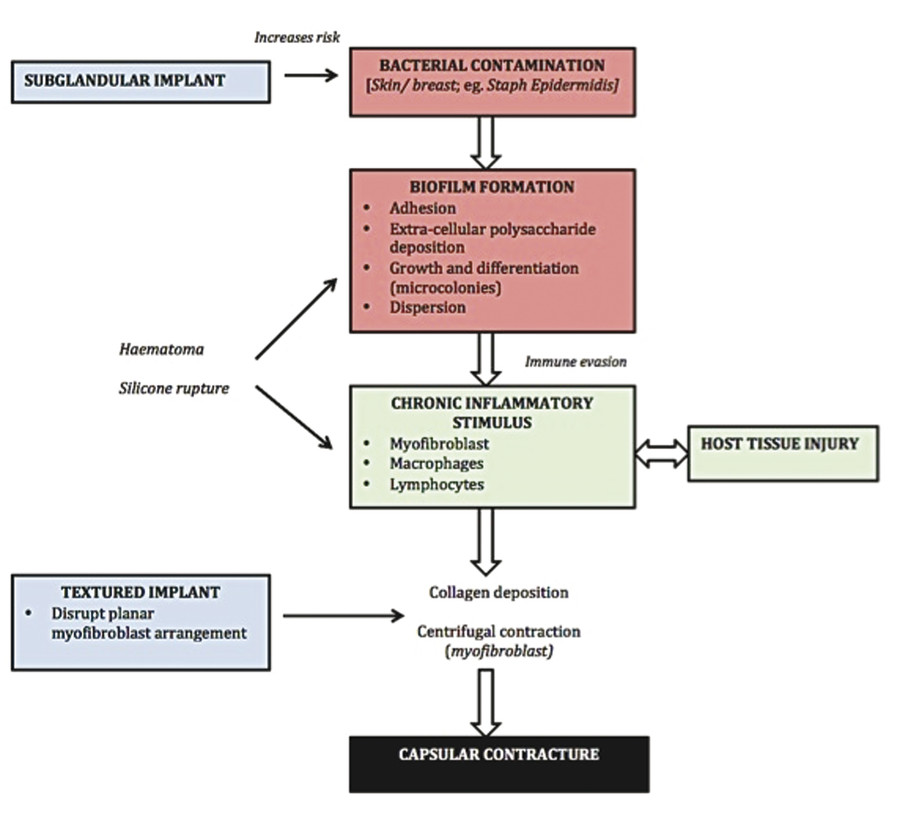 Capsular contracture (CC) is a common but unpredictable complication following aesthetic and reconstructive breast prosthesis implantation. The reported rates of CC vary widely, ranging from 0.5% to 59%. 1 ,​ 2 The heterogeneity of reported studies (implant type, surgical technique, and follow up period) precludes an accurate estimate of overall incidence. Nonetheless, CC is one of the commonest indications for reoperation in aesthetic breast surgery. 3 Moreover, revisional surgery is technically challenging, with poorer patient satisfaction. 4 This chapter aims to review the pathogenesis of CC formation with a focus on the subclinical infection theory, biofilm formation, and the implications of implant texturing and planes. The evidence for current nonoperative and operative strategies for CC will also be evaluated.