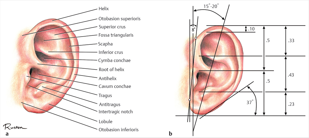 Fig. 15.1 (a) The normal ear and its parts. (b) The normal ear and its proportions.