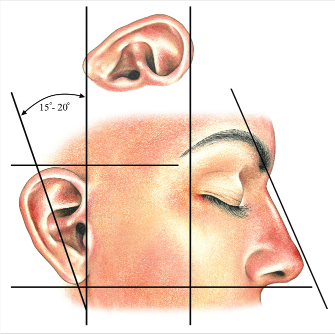 The axis of the ear is defined as the line of balance through the long dimension of the ear. An inclination of 15 to 30 degrees from the vertical is acceptable with 20 degrees being optimal. The most important aspect of this measurement is that the ear tends to incline posteriorly on visual inspection. With regard to position, the distance of the ear from the orbit should be roughly one ear length posterior from the lateral orbital rim or approximately 6.5 to 7.5 cm. The level of the superior aspect of the helix correlates with the brow, and the inferior aspect of the lobule correlates with the base of the columella. These positions are depicted in Fig. 15‑2.
