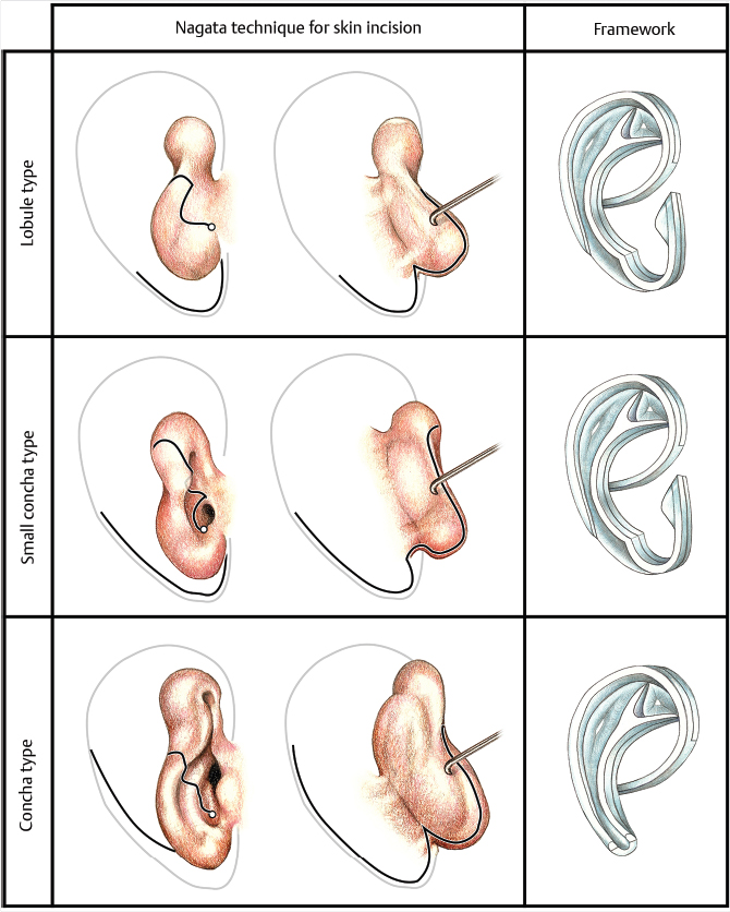 Fig. 15.4 Nagata’s technique for skin incision and framework creation based on each microtia classification.
