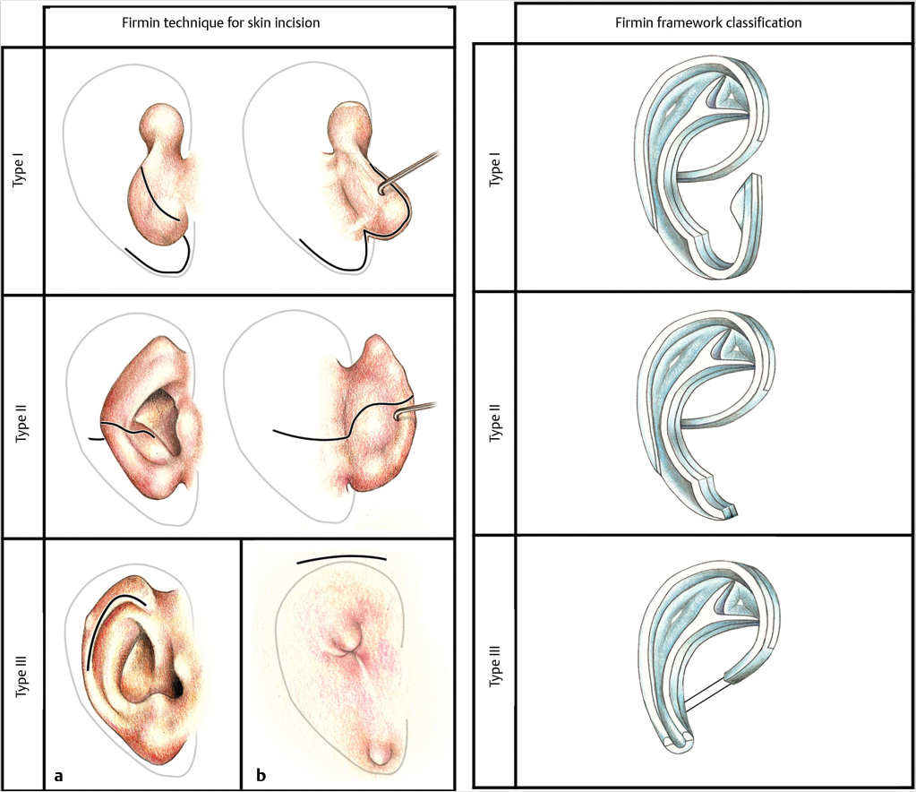 Fig. 15.5 Firmin’s technique for skin incision and framework creation based on each microtia classification.