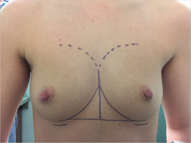 The midline should be marked together with the position of the original inframammary creases, which can be joined with a horizontal line to assist with achieving symmetry. The upper extent of the dissection can be marked so as to prevent overdissection of the upper pole (▶Fig. 15.2).