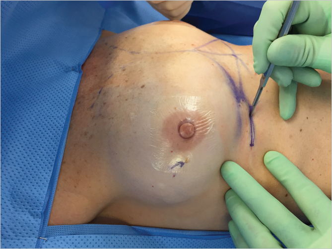 Inframammary incision is placed 1 cm below the breast crease.
